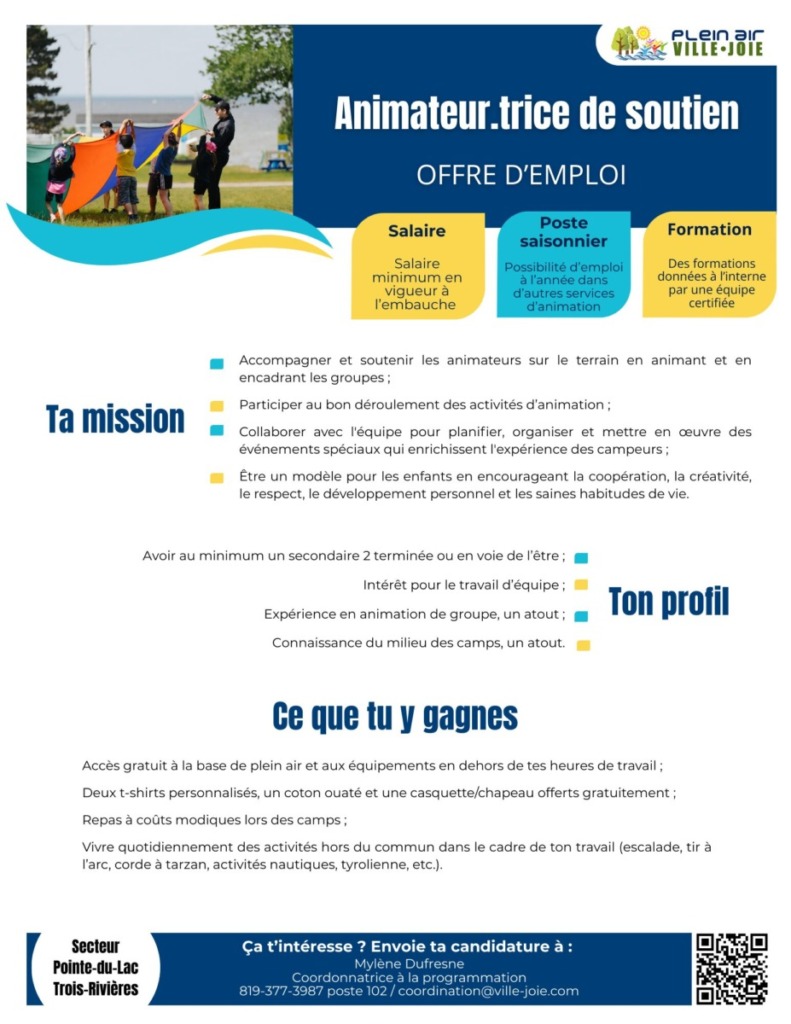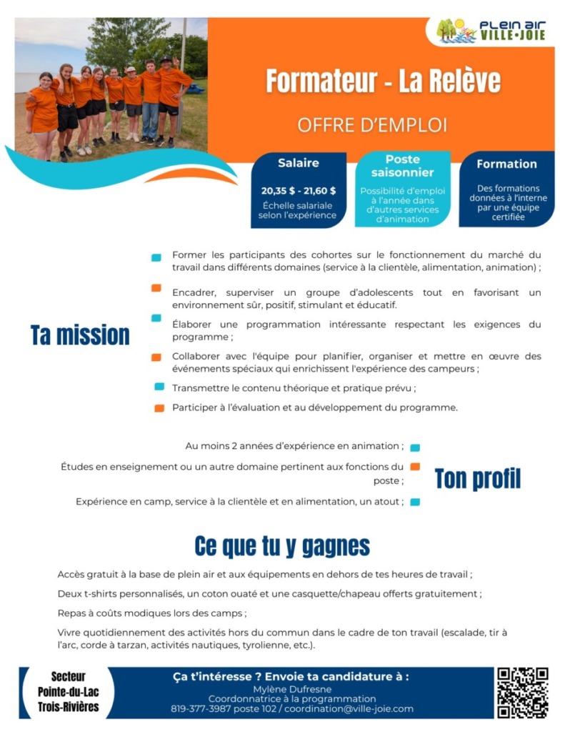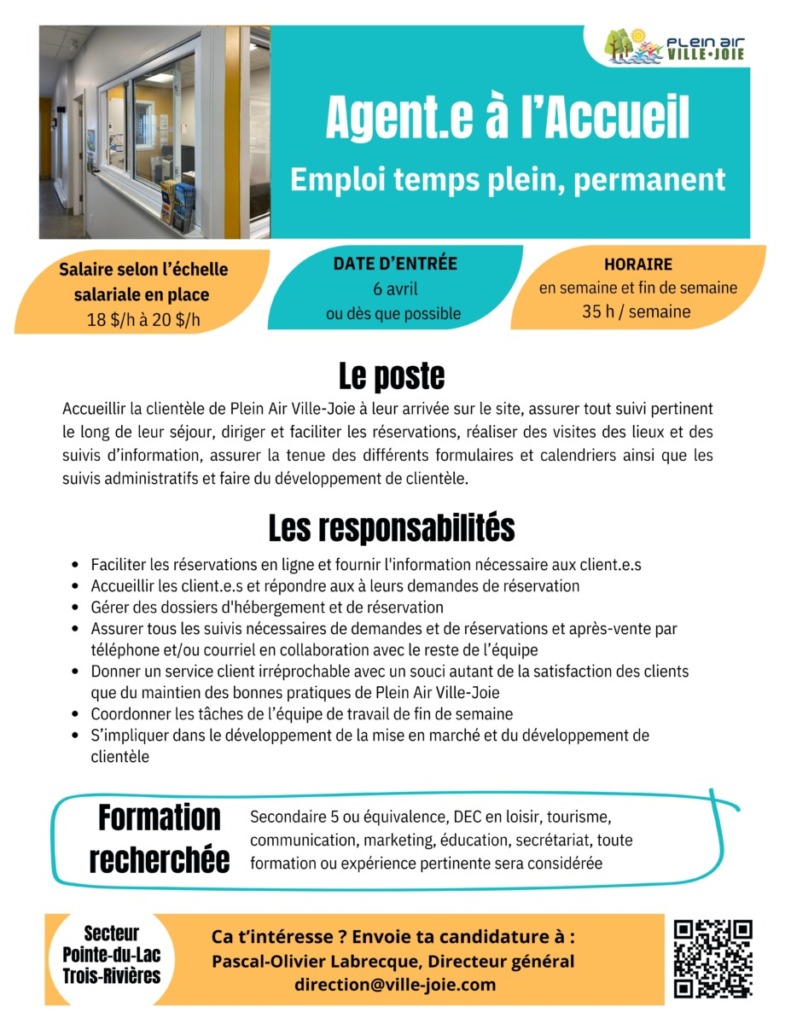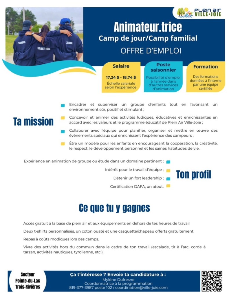 En plus d’une équipe de travail dynamique et accueillante, on t’offre une plage avec les plus beaux couchers de soleil de Trois-Rivières, des activités hors du commun directement sur le site ainsi qu’un accès à la base de plein air et ses équipements gratuitement en dehors de tes heures de travail.