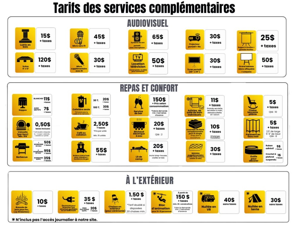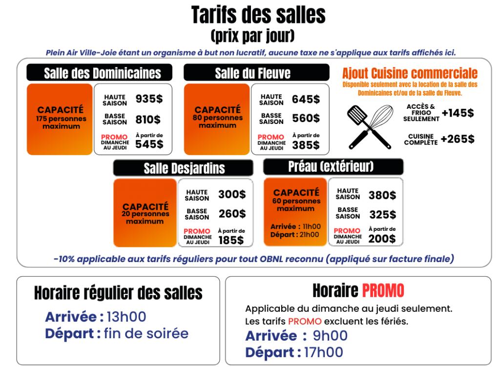*Les salles, chalets et forfaits ne sont pas taxables. *Les OBNL bénéficient d’une réduction de 10% sur le tarif régulier (non cumulable avec d’autres réductions).