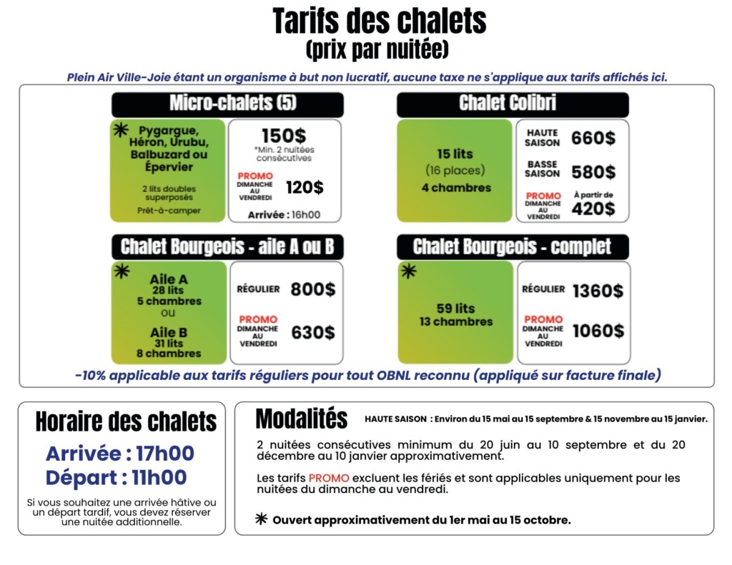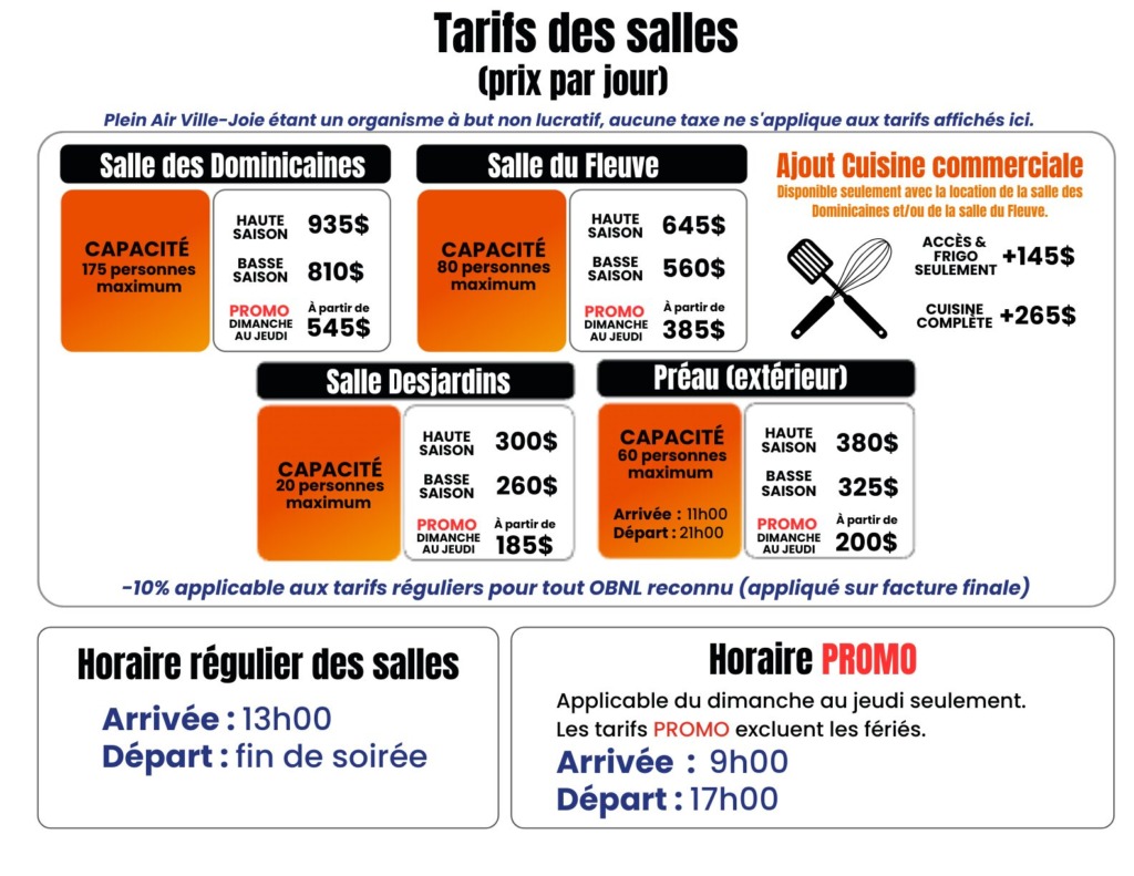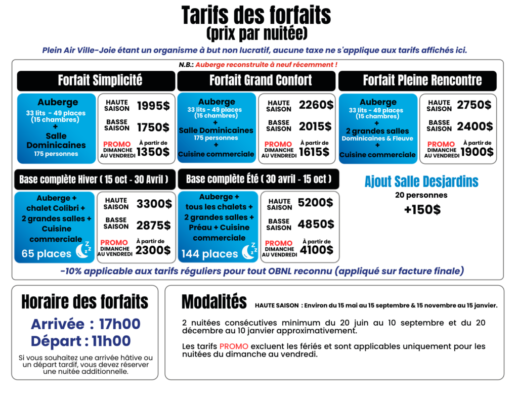 *Les salles, chalets et forfaits ne sont pas taxables. *Les OBNL bénéficient d’une réduction de 10% sur le tarif régulier (non cumulable avec d’autres réductions).